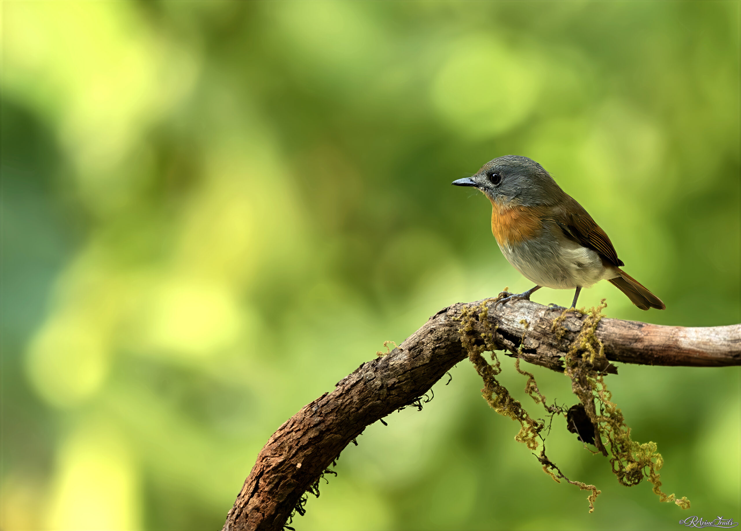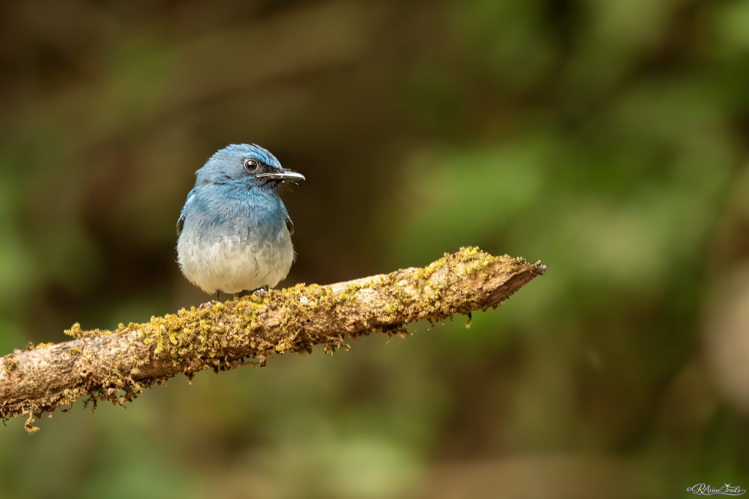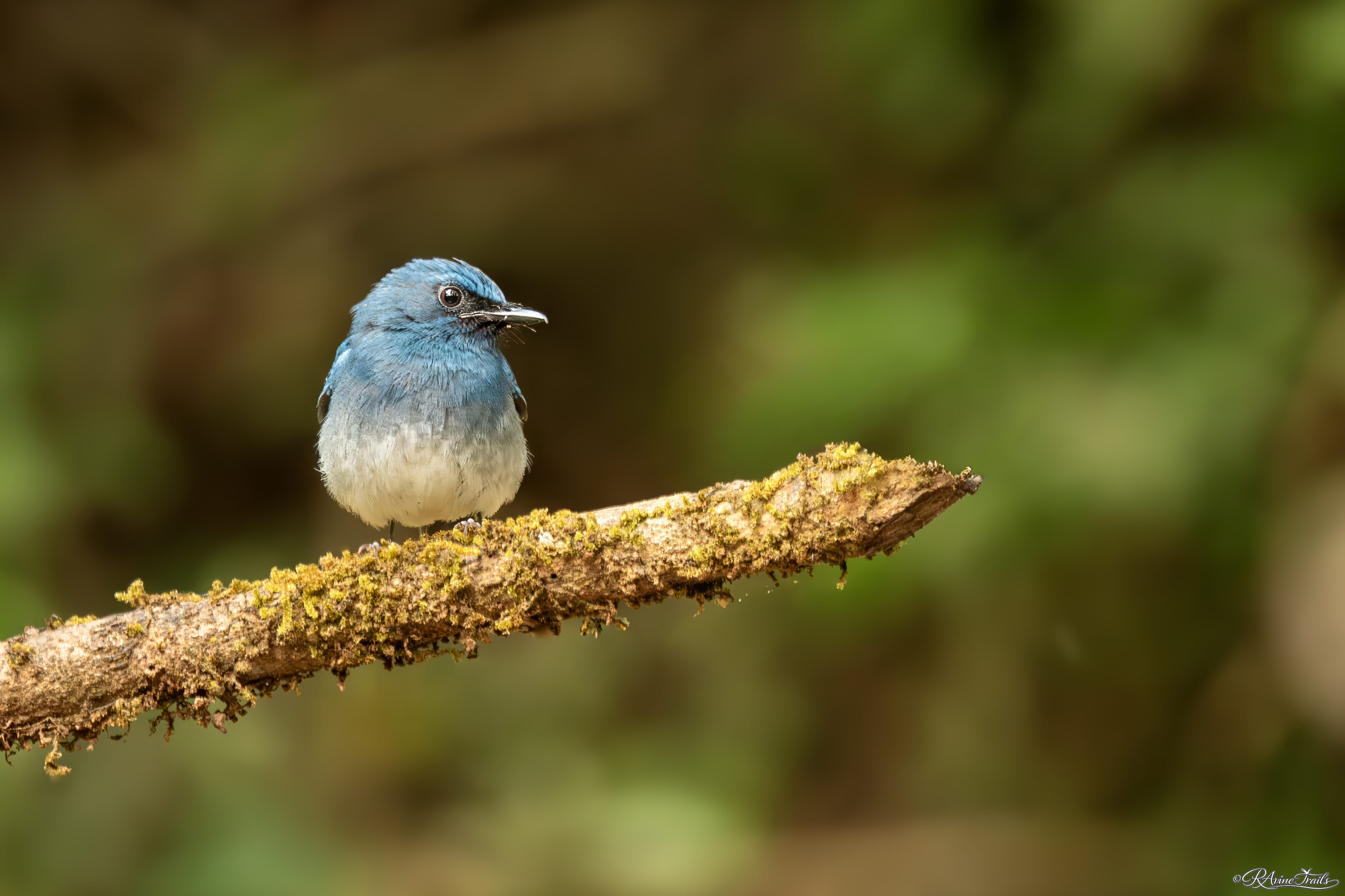 In the evergreen hush, where sunlight filters through layers of ancient canopy and settles softly on moss-lined branches, a flash of blue catches the eye. The white bellied fly catcher sits quietly, small, poised, and impossibly delicate, as though painted into the forest itself.